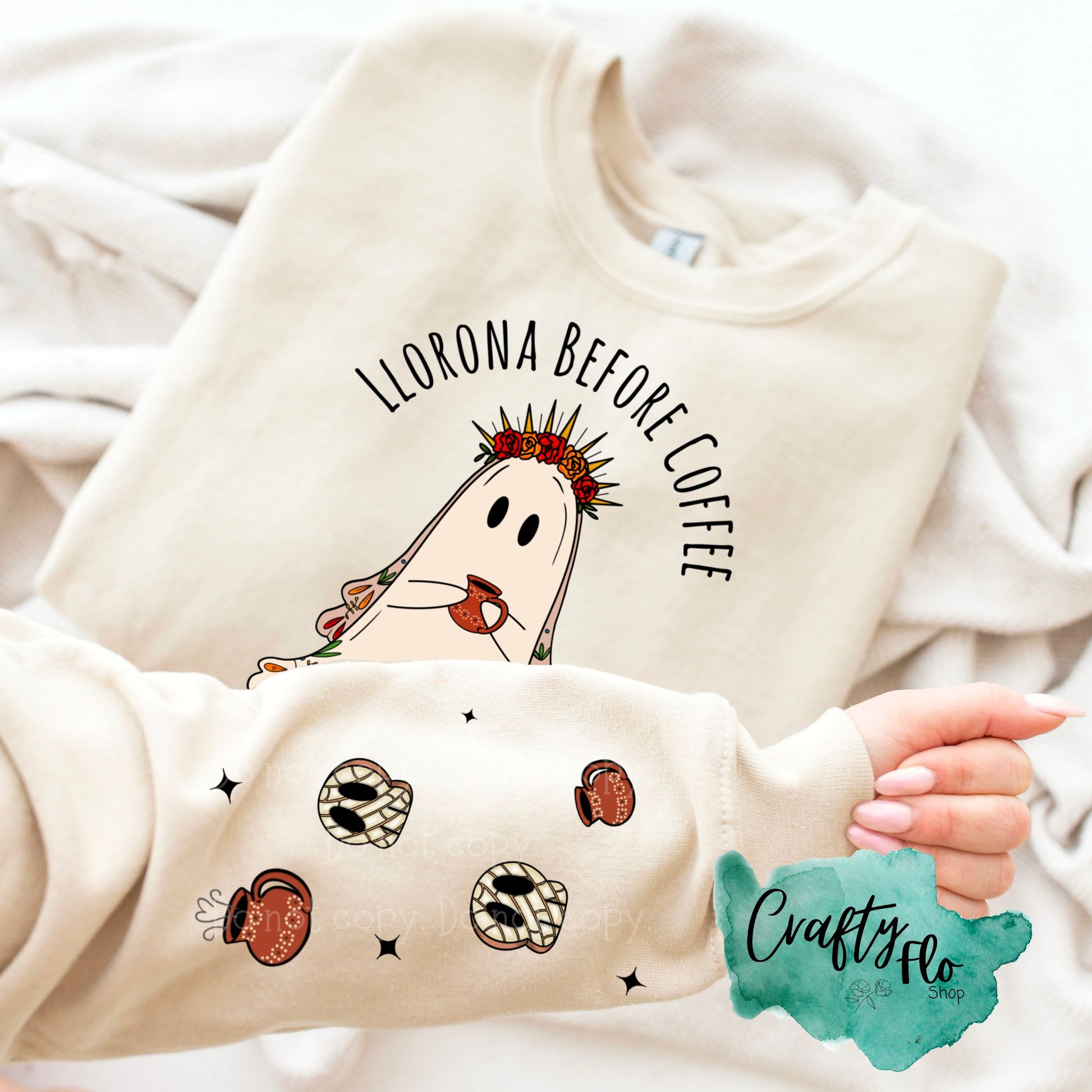 Llorona before Coffee Sweatshirt with front and sleeve designs | Llorona sweatshirt | friend gift sweatshirt