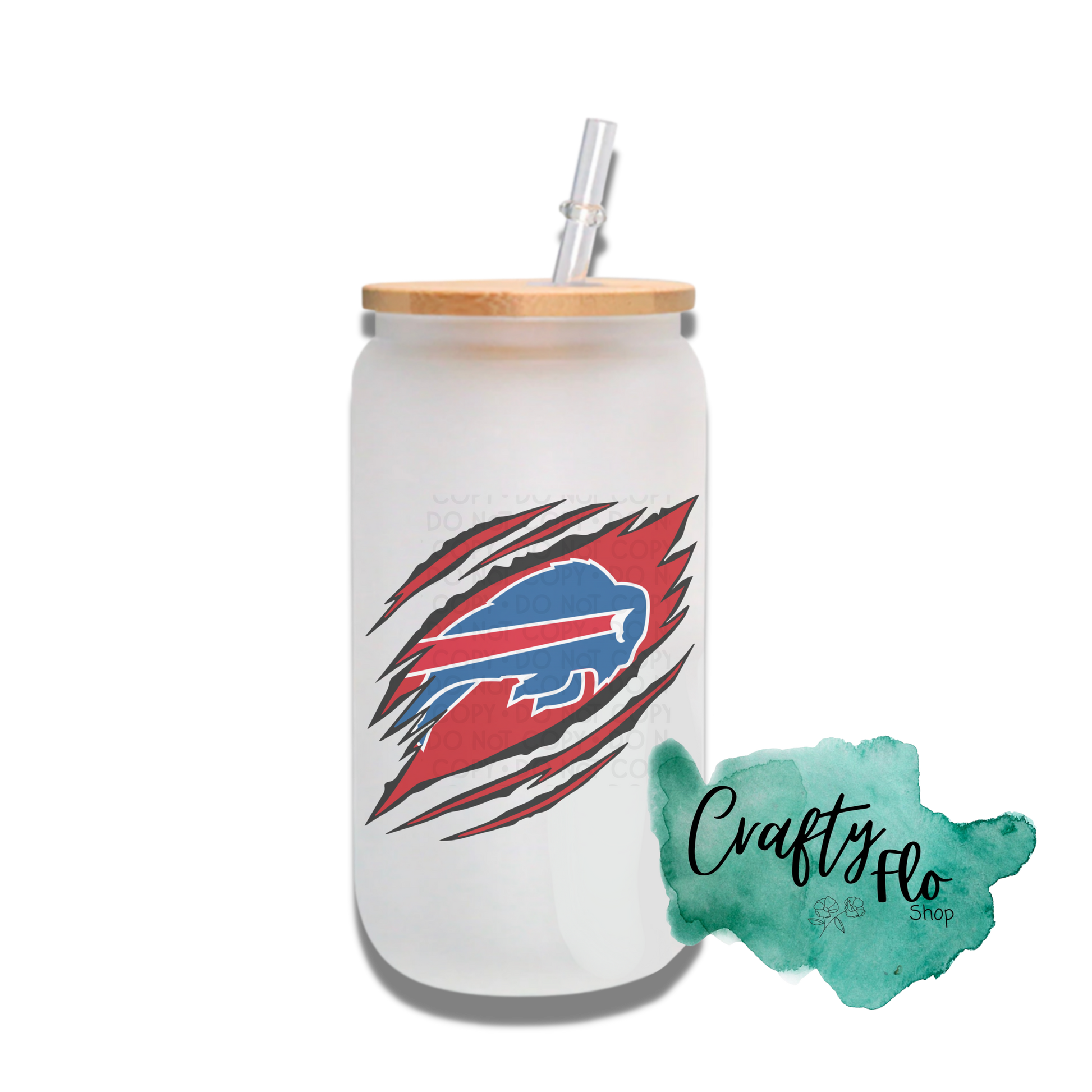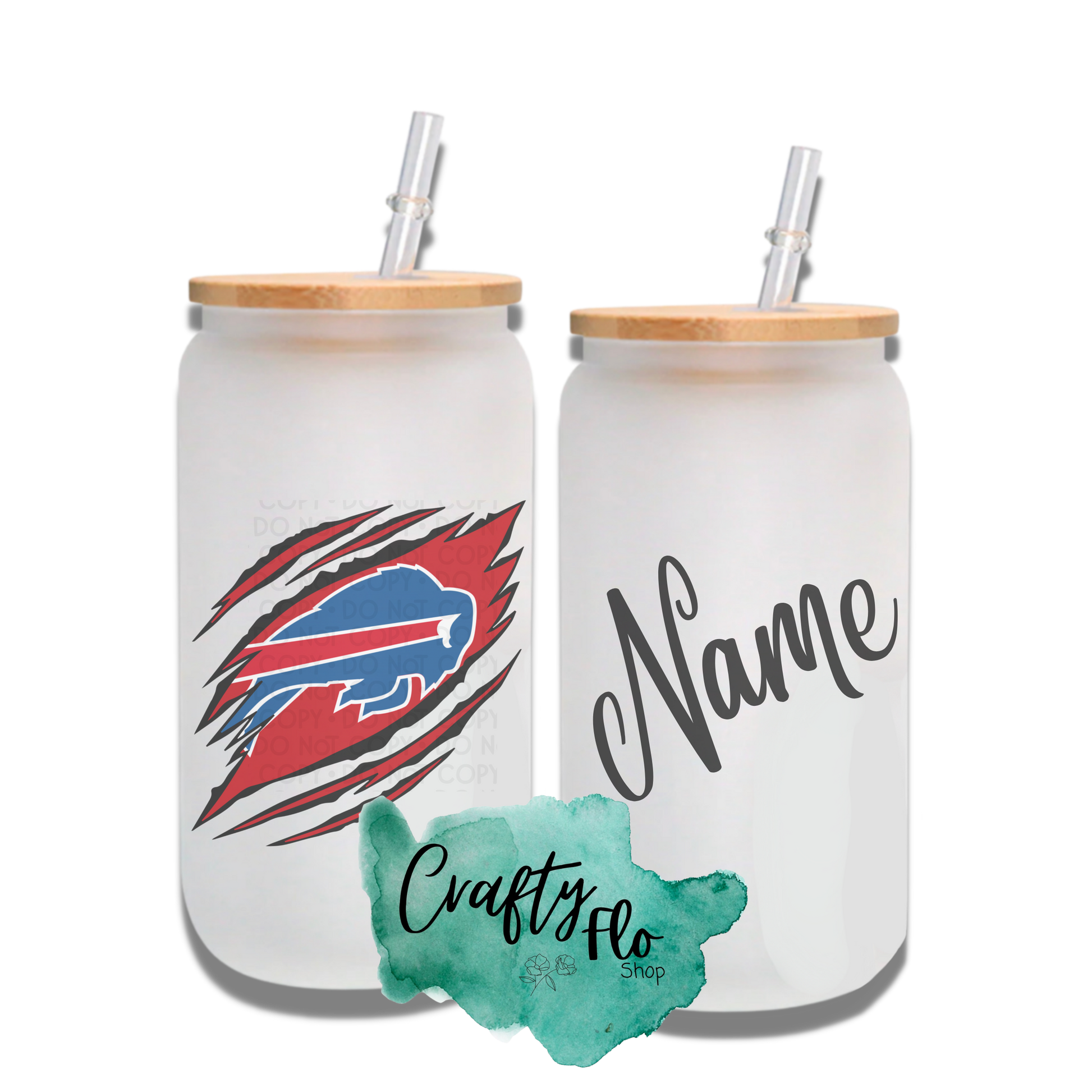 Personalizable Buffalo Bills Inspired Theme 16oz glass can with straw/ Add name at checkout