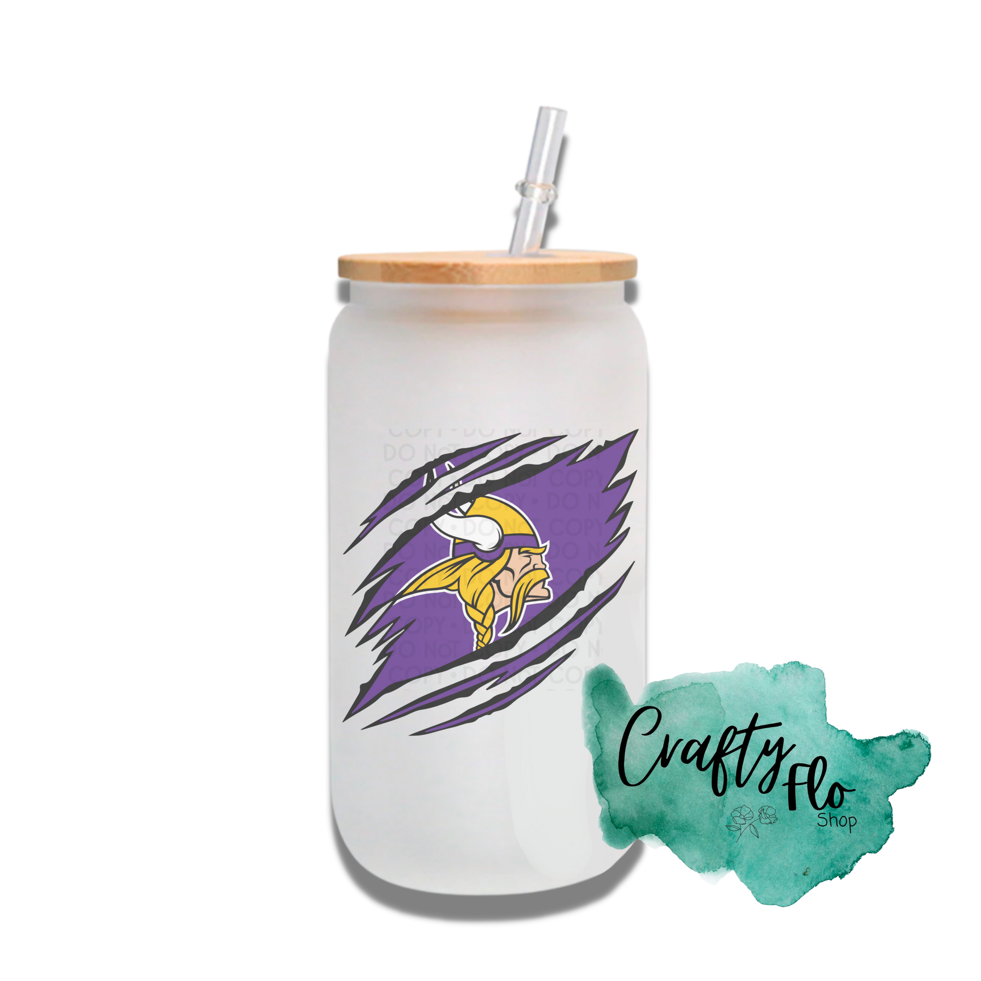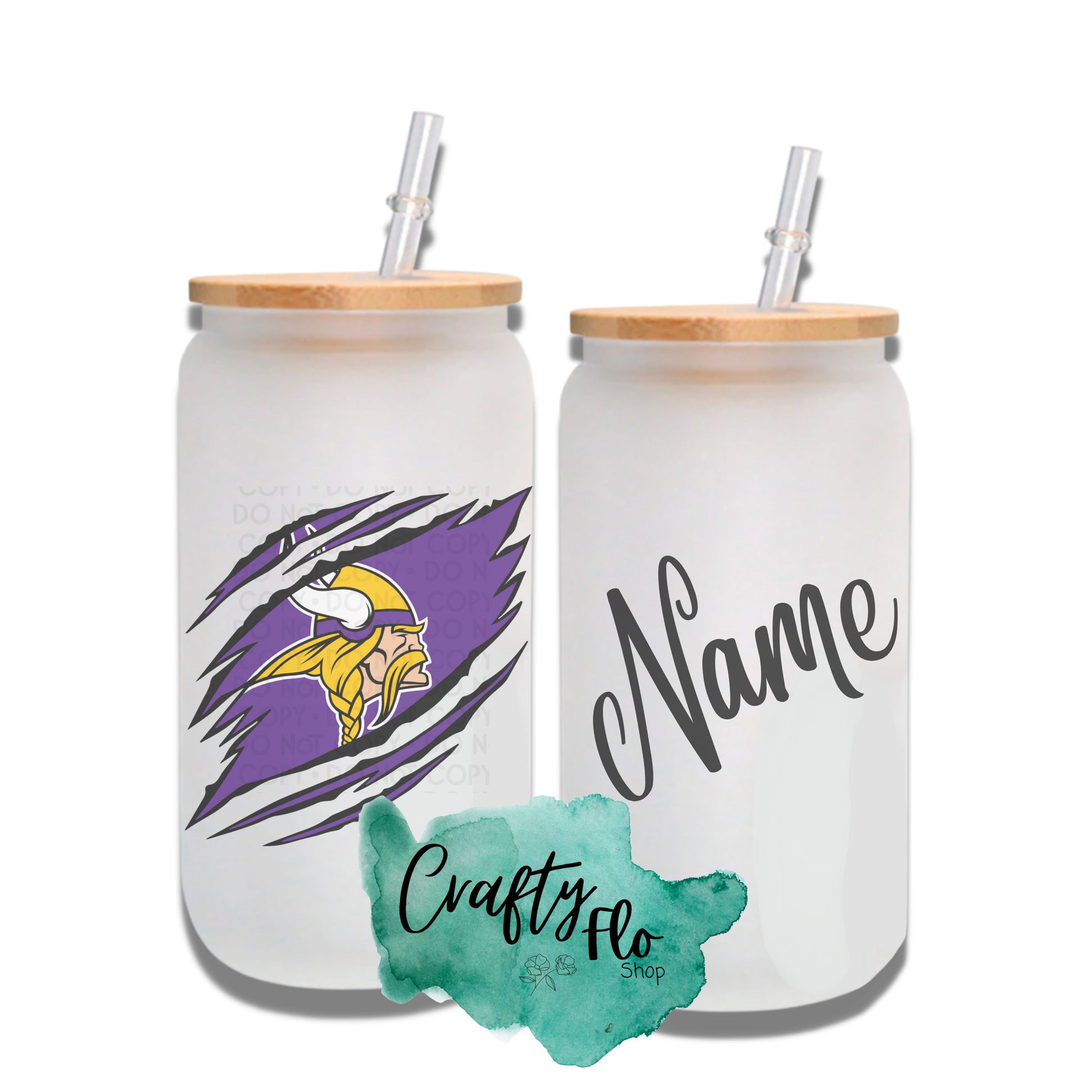 Personalizable Minnesota Vikings Inspired Theme 16oz glass can with straw/ Add name at checkout