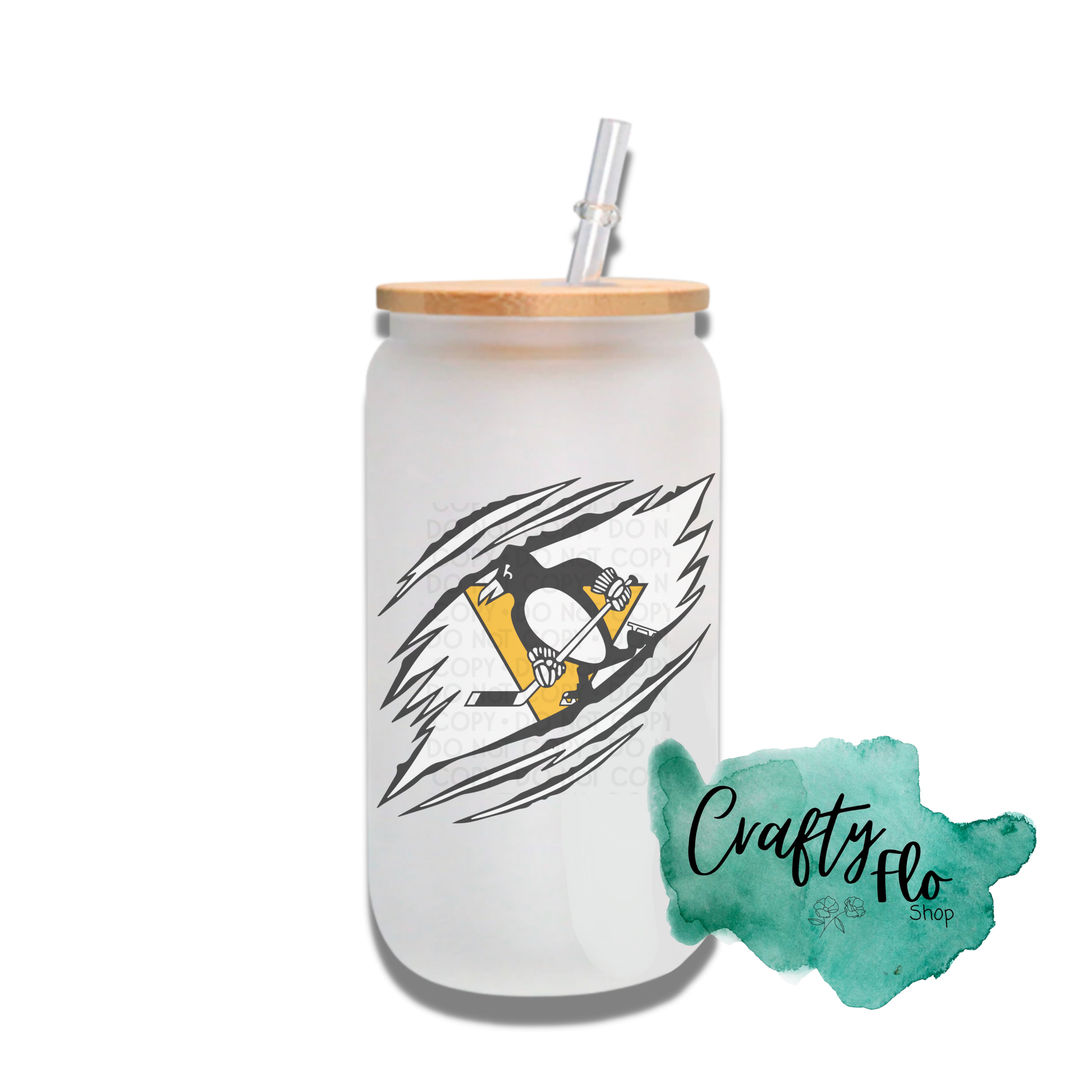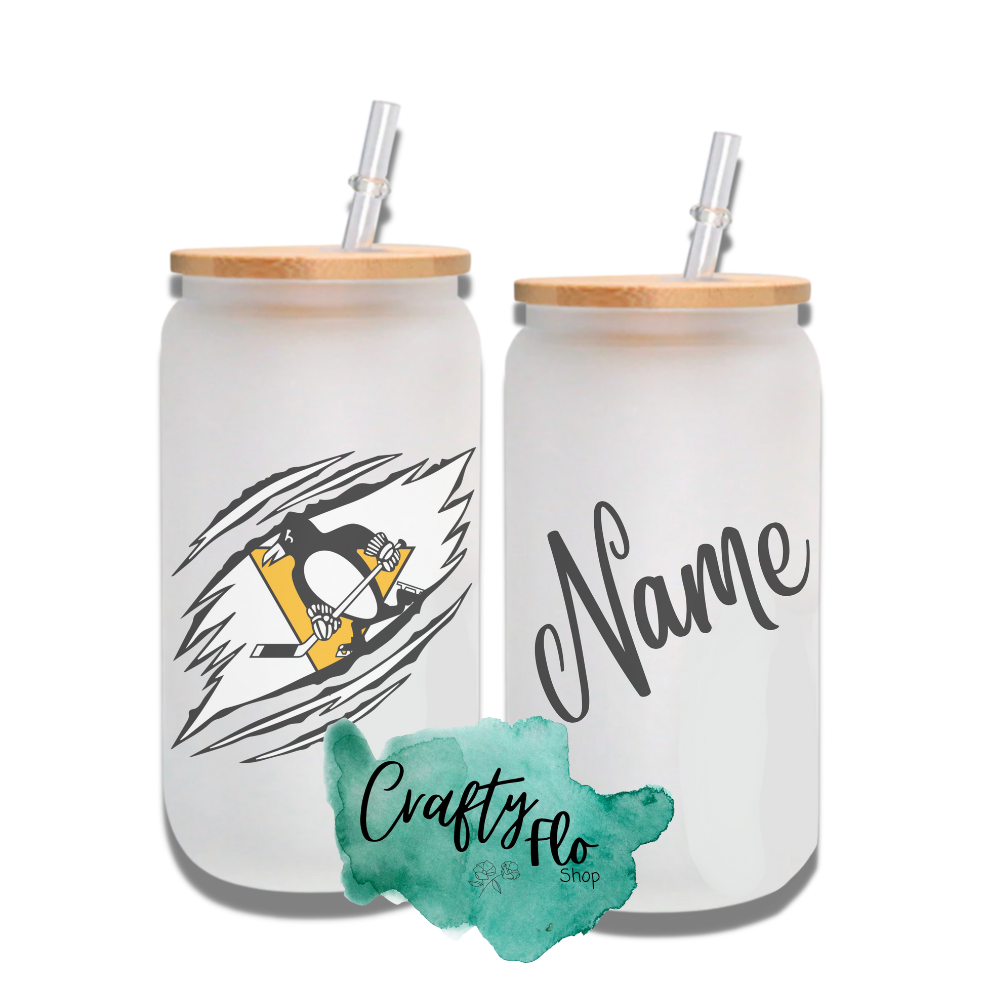 Personalizable Pittsburgh Penguins Inspired Theme 16oz glass can with straw/ Add name at checkout