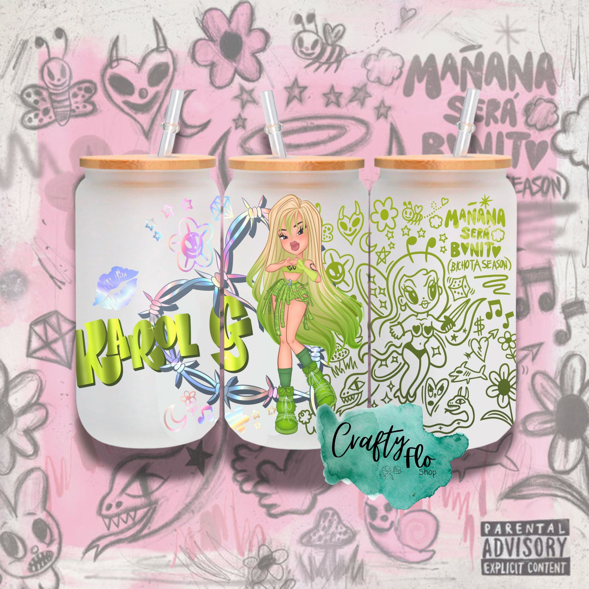 Green KG Doll Mañana sera bonito album inspired 16oz frosted or clear glass cup with bamboo lid and straw| bichota fan glass can