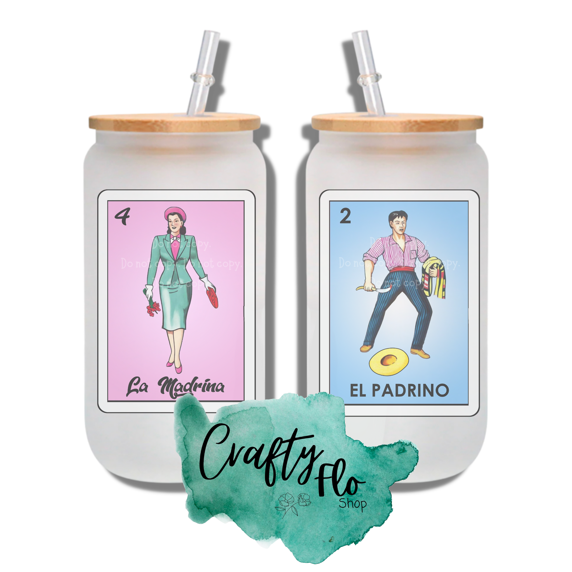 Madrina and Padrino Lotería card inspired 16oz frosted glass can with bamboo lid and straw