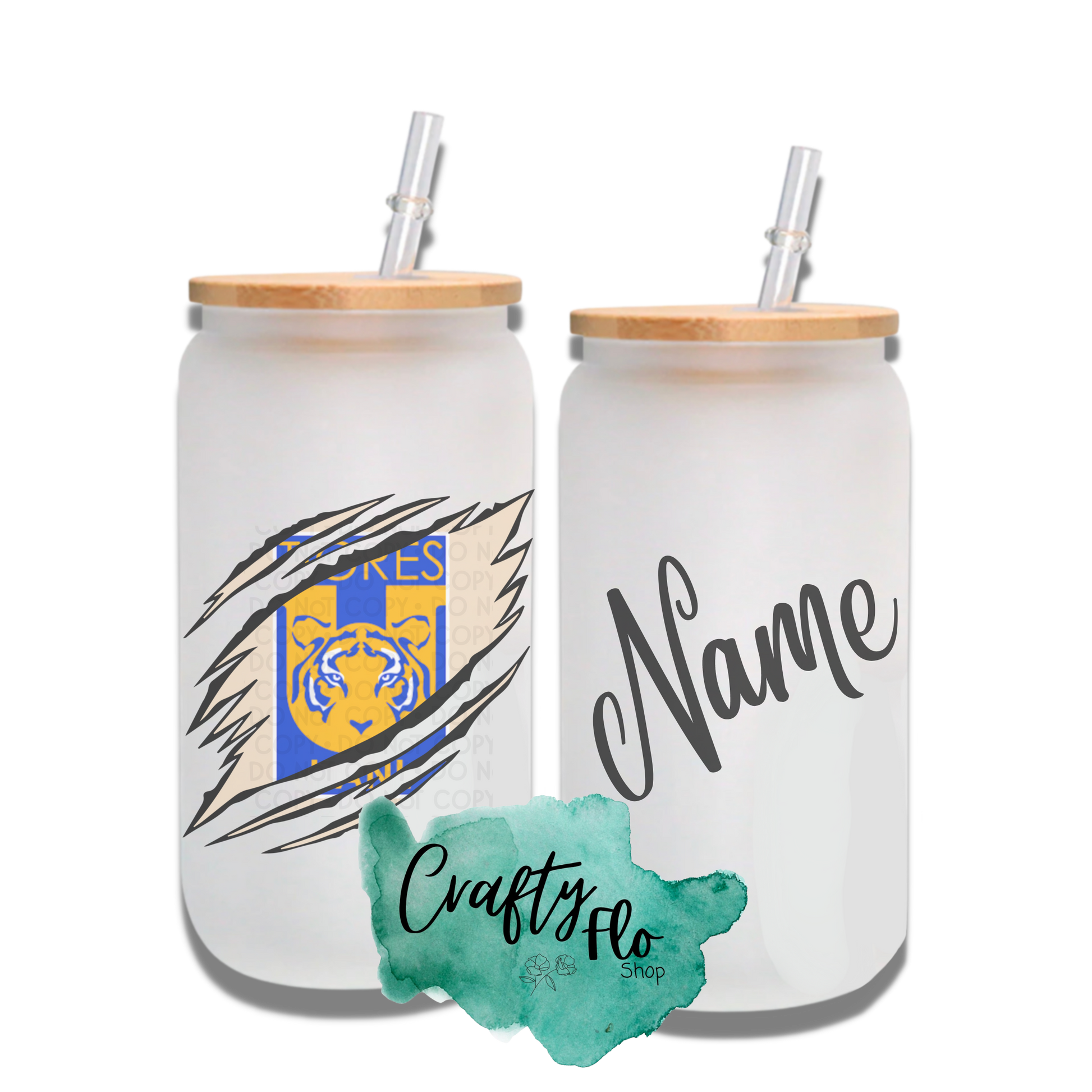 Personalizable Tigres Inspired Inspired Theme 16oz glass can with straw/ Add name at checkout